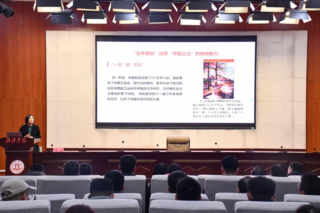艾霞老师“锚定‘三位一体’战略,推动全会精神融入思政教育”为题,从理论逻辑、实践方向、融入路径三个层面展开深入辅导。一是厘清理论逻辑,把握战略定位。教育、科技、人才是全面建设社会主义现代化国家的基础性、战略性支撑,三者一体统筹推进,是新时代发展的重大战略部署。二是锚定实践方向,对接国家需求。思政教育要精准对接全会提出的“建设现代化产业体系”“扎实推进乡村全面振兴”等目标任务,将现实课题融入课堂教学,引导学生认清专业学习与国家发展的内在关联,厚植家国情怀。三是创新融入路径,推动落地见效。丰富教学载体,搭建实践平台,强化榜样引领,通过“身边人讲身边事”的形式,让抽象理论转化为可感、可学、可践的行动指南。