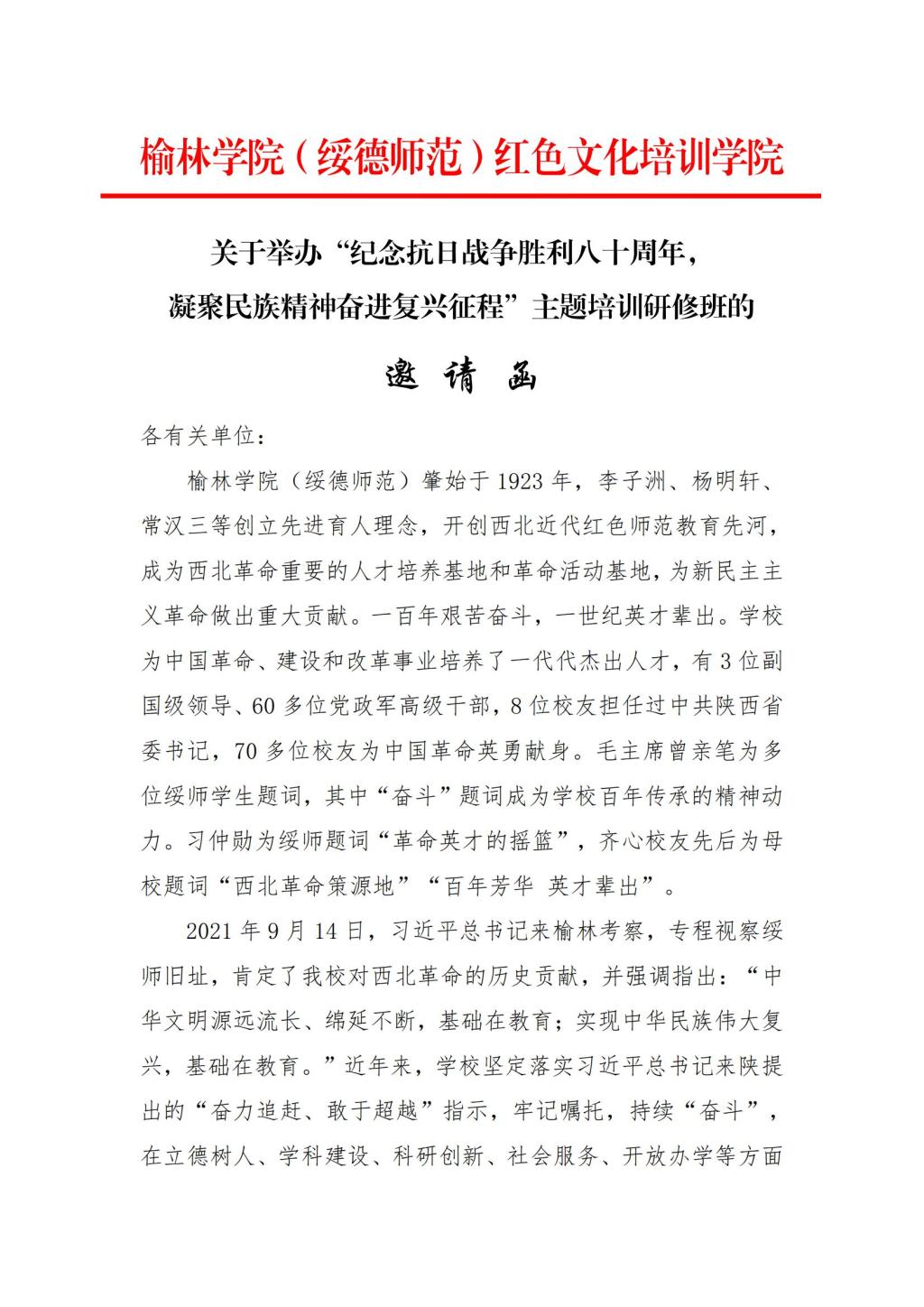 关于举办“纪念抗日战争胜利八十周年,凝聚民族精神奋进复兴征程”主题培训研修班的邀请函