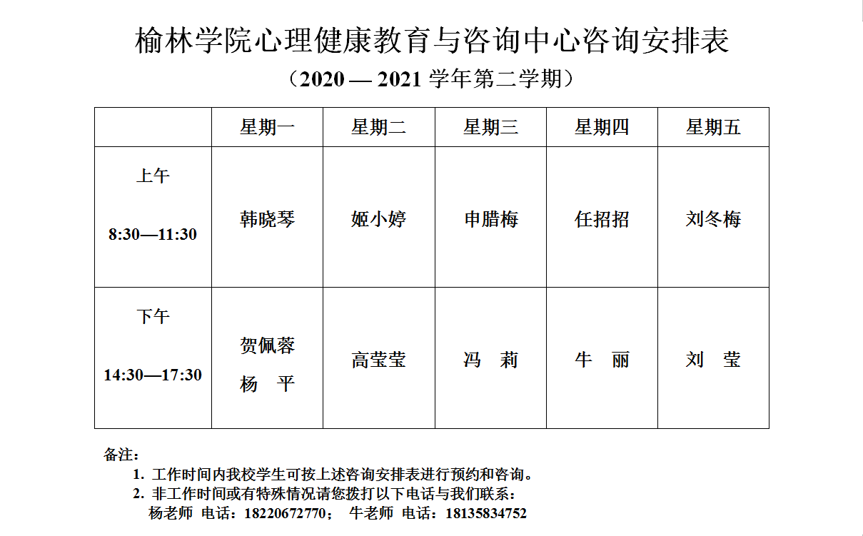 万象城allwincity官方网站入口2020—2021学年第二学期心理健康教育与咨询中心咨询安排表