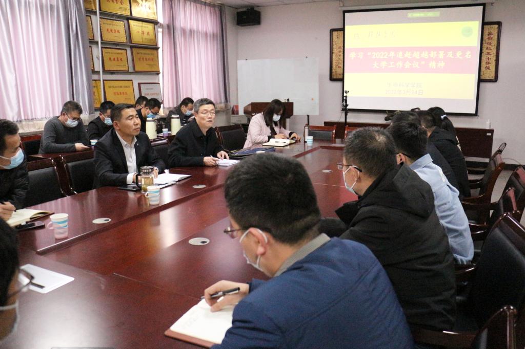 3月24日中午,生命科学学院在1S-203会议室召开会议,学习传达学校2022年追赶超越任务部署及更名大学工作会议精神,副校长康伟出席,生命科学学院全体教职工参加会议。