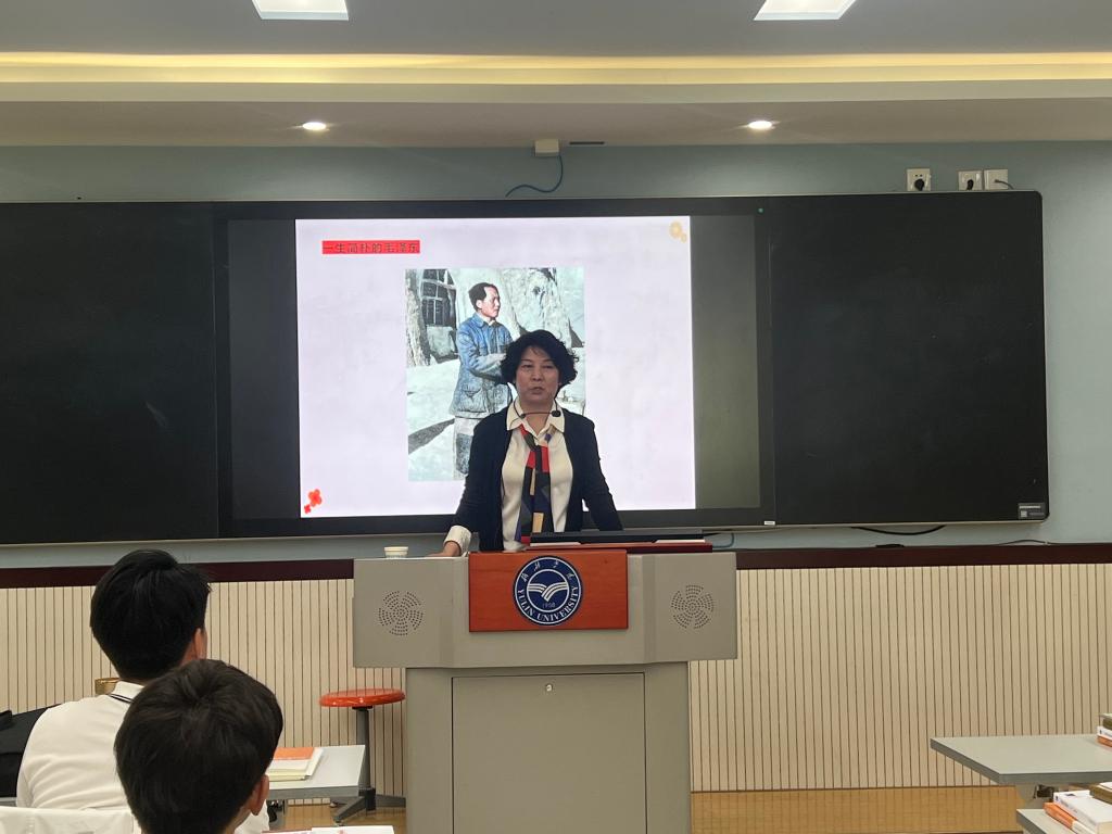 刘亚莲从中共中央转战陕北的背景、自己创作长篇纪实文学《毛主席在佳县》的创作机缘导入,讲述了自己曾用两年时间,一步一个脚印去采访当年转战陕北过程的当事人,走访了毛泽东转战陕北在佳县住宿过的16个村庄。先后上北京、下西安行程数万里,采访了毛主席的女儿、警卫员、作战参谋、卫士长、机要秘书和身边的工作人员。佳县孕育着深厚的红色记忆,红色故事,毛主席在转战陕北的一年零五天中,待在佳县的时间最长。刘亚莲按照毛泽东同志在佳县的转移路线,层层推进,实地采访当年毛泽东同志的房东,根据房东口述和一张张照片反映出毛泽东同志并不是高高在上,而是平易近人,说的话并非是阳春白雪,而是善于学习和运用当地的语言,用通俗易懂的语言和人民群众打成一片。通过照片和视频背后的故事,刘亚莲展示了语言的魅力,文学的使命;同学们犹如身临其境,跟随着刘亚莲老师的讲授重走了一遍转战路线,意义非同凡响。
