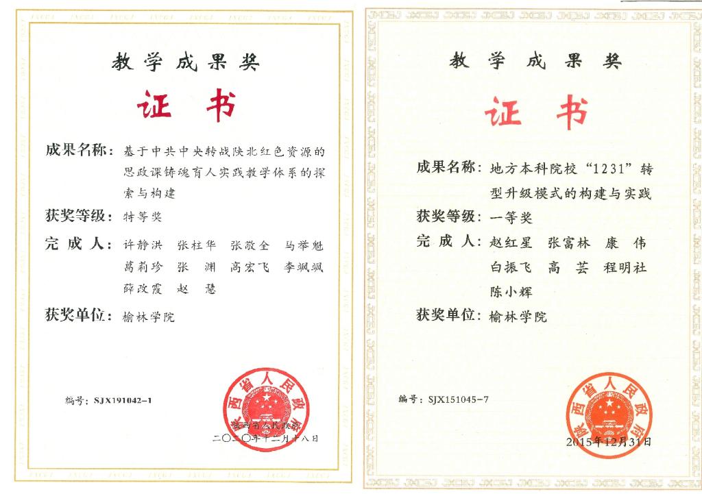 近年来,学校有8人荣获省级教学名师荣誉称号,4名教师在陕西高校思政“大练兵”活动中获得思政课程“教学能手”荣誉称号,获得陕西高校课堂教学创新大赛一等奖1人,二等奖2人。学校获得陕西省教学成果奖10余项,其中陕西省教学成果一等奖2项,特等奖1项;4人荣获省级“教学管理先进个人”荣誉称号,荣获2项省级“教学管理先进集体”荣誉称号,在省级及以上教育教学比赛中获得各类荣誉40余项。
